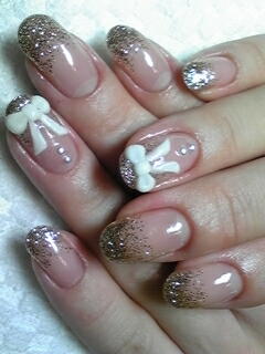 | ゴールドラメフレンチ。ストーンリボン。パールのリボン。これだけいろいろやってもちゃんとまとまってます。 |