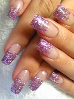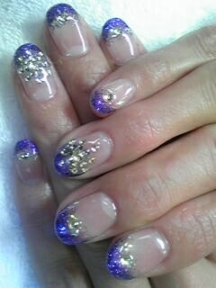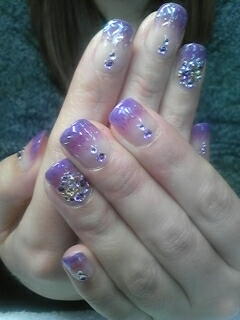 | こちらパープルカラーグラデーションに、お客様お気に入りの縦ラメを入れてキラキラ度UP。ストーン一部ゴージャスに乗せてマス。 |