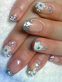 | シルバーのホログラムフレンチがキラキラして冬っぽいです。お花も白くて雪みたい。 |