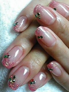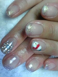 | ピンクラメグラデーションに添えたクリスマスカラーのストーンがなんとも可愛い。 |