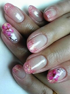| ピンクのラメでグラデーション+久々の押し花。ちょこっとストーンも置いて上品な仕上がりです。 |