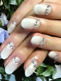 | パールホワイトに真白のアクリル絵の具を使ってスポンジグラデーション。ドレスに合わせてふわふわ感を出しました。根元にストーンを飾って・・・。 |