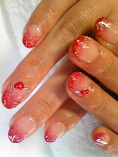 | 真赤なグラデーションフレンチにクリアの縦ラメがキラリ。ハートの赤パールも可愛い♪ |
