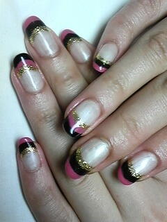 | ショッキングピンク・ブラック・ゴールドラメのトリプルフレンチ!ベースにパールを使ってゴージャスに仕上がってます。 |