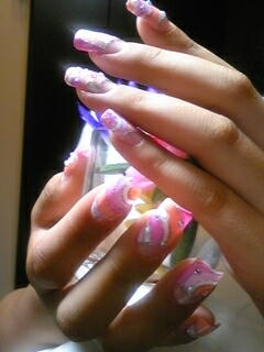 | 前回もプッチ風だったお客様。色味を変えて今回もプッチ。ピンク系に統一して、銀ラメライン&ストーン散らしてなんとも可愛い仕上がりデス♪ |